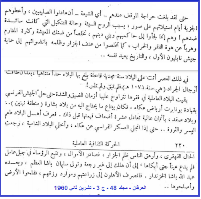 " بعد ذكر العلاقات التاريخية بين العامليين والفرنسيين، ..فلما قدِم نابليون الكبير لفتح عكا قدّم العامليون له الزاد و الميرة وأنواع الأطعمة ... فشكر لهم صنيعهم ووعدهم المكافأة متى عاد ظافرا .... (لكن) أحمد باشا الجزار جعل لهم المكافأة قتل علمائهم وزعمائهم .. وحرق كتبهم ... وكأن ذاك الامبراطور العظيم عرف أنكم ستهبطون هذه البلاد بعد قرن ... فالعامليون اليوم يطالبونكم بتلك المكافأة التي وُعدوا بها...." انتهى